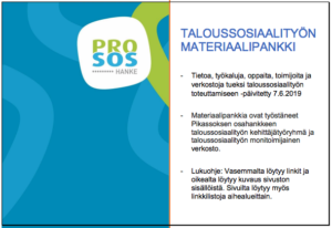 PRO SOS -Pikassoksen osahankkeessa on yhteisesti työstetty taloussosiaalityön materiaalipankki. Materiaalipankkiin on koottu tietoa, työkaluja, oppaita, toimijoita, verkostoja ja materiaaleja tueksi taloussosiaalityön toteuttamiseen. Materiaalipankkia ovat työstäneet Pikassoksen osahankkeen taloussosiaalityön työryhmä, taloussosiaalityön monitoimijainen verkosto ja hankekoordinaattori.